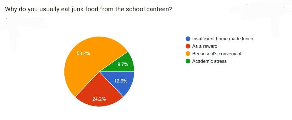 Students often struggle to manage their tasks, balancing their grades, extracurricular activities, social life, and leisure time. As a result, they find processed foods effortless to consume during tight deadlines and academic stress. A survey conducted within our school community showed that over 50 per cent of students eat junk food because it’s convenient. This indicates that students often choose junk food over healthier options, not only because it’s more appealing but mainly because it’s easily accessible and widely favored.